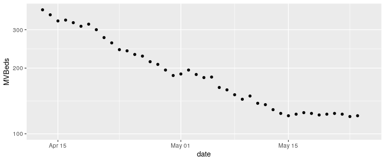 ggplot(subset(UKDF, date > as.Date("2021-04-12")), aes(x = date, y = MVBeds)) + geom_point() + logyAll those functions have many available arguments, most of which I left at the defaults.