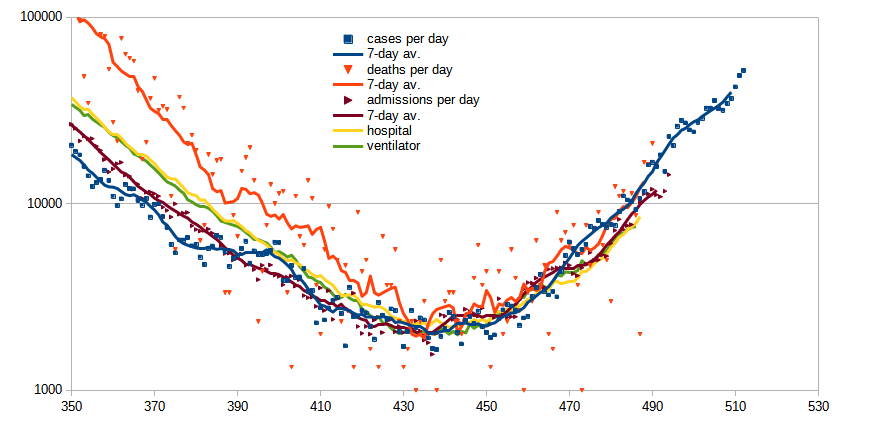 Yup that's pretty much what I concluded from the phase plotsshpalman wrote: Sat Jul 17, 2021 12:58 pmHere's a similar thing done for the second wave last autumn (day 150 was the 19th of July last year):shpalman wrote: Tue Jul 13, 2021 6:31 pmThe lag between cases and deaths actually seems to be about three weeks, with a 0.3% CFR, whereas the lag between cases and hospital admissions per day is about two weeks, with about 5% of cases ending up in hospital.lpm wrote: Tue Jul 13, 2021 1:56 pm It's a bit of a mystery why hospitalisation numbers are tracking below all the models' forecasts. The gearing can't be too unexpected, the age profile of new cases can't be too unexpected.