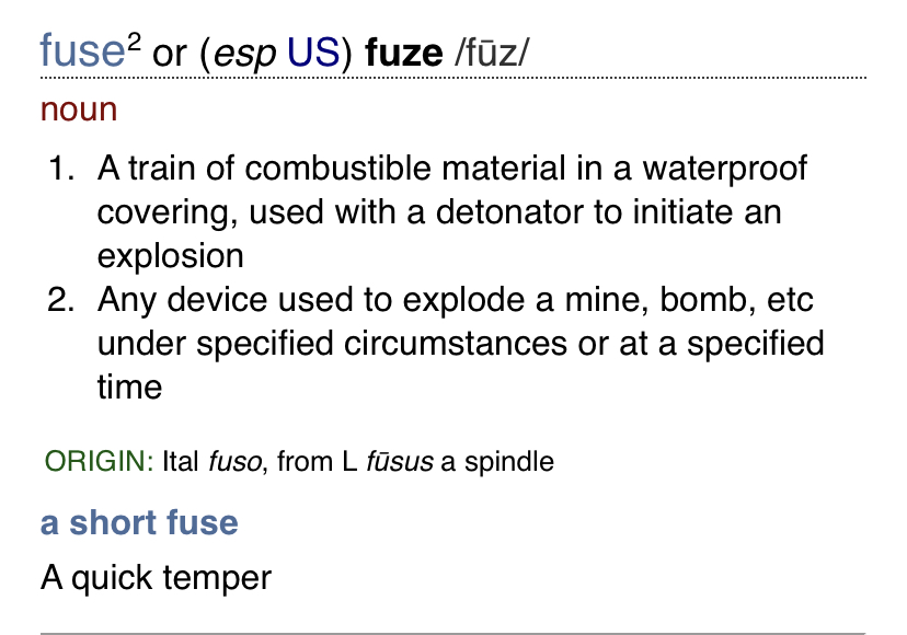 *Dan Kaszeta is adamant that "fuze" is the correct spelling even in the UK but I refuse to believe him on THAT.