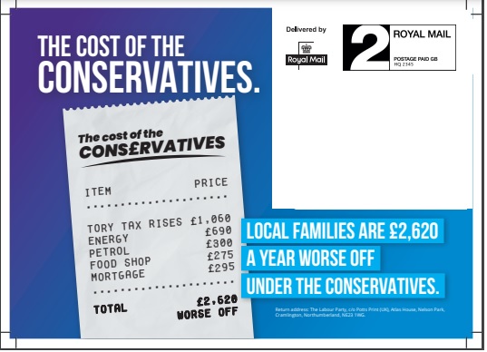 That side is predominantly red and does say "Vote Labour" in medium sized letters. So maybe the impression left by the leaflet will depend on which side up it lands on the voter's doormat.